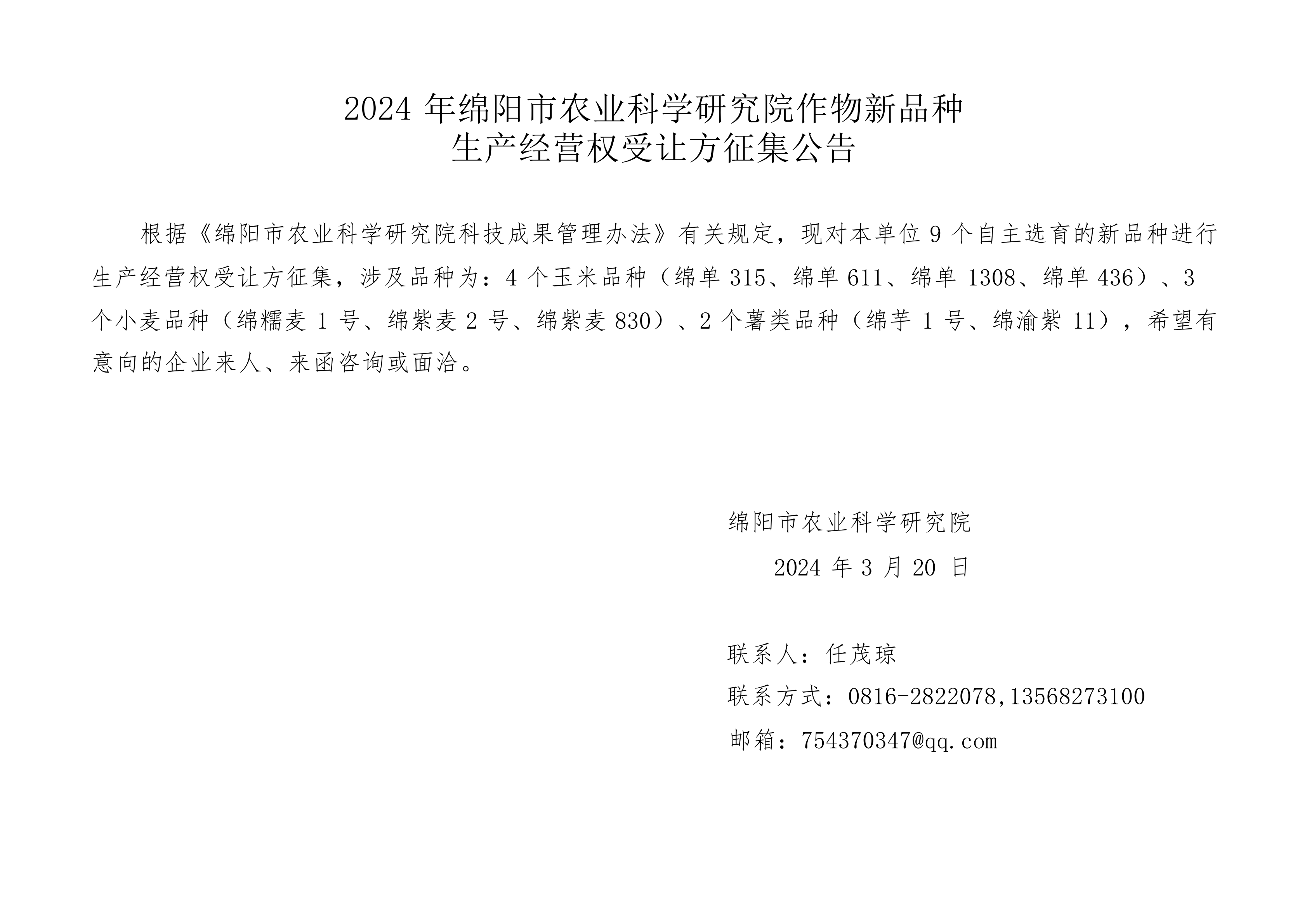 2024年彩运网作物新品种生产经营权受让方征集公告