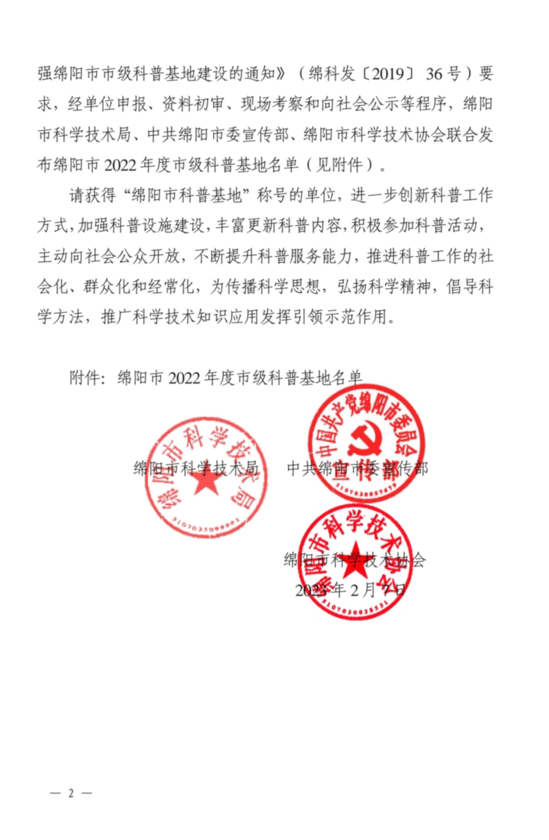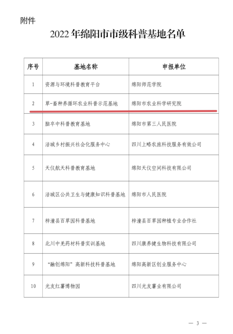 2月7日,绵阳市科学技术局、中共绵阳市委宣传部、绵阳市科学技术协会《关于发布2022年度市级科普基地名单的通知》,经申报、资料初审、现场考察和网上公示等程序,我院《草-畜种养循环农业科普示范基地》被认定为“绵阳市科普基地”。